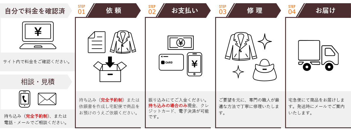 持ち込み(完全予約制)または依頼書作成の上宅配便で、商品をお預けのうえ、ご依頼ください。